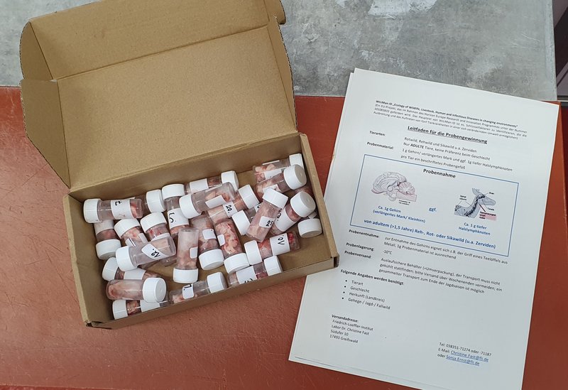 Die Wissenschaftler benötigten jetzt wieder bundesweit Probenmaterial von Rot-, Reh- und Sikawild. Dafür sollte Probenmaterial von adulten Stücken vom Gehirn (verlängertes Mark) und tiefe Halslymphknoten für die Untersuchung in ein Probenröhrchen extrahiert werden. Aus den Proben wird die DNA präpariert und eine Genotypisierung durchgeführt.