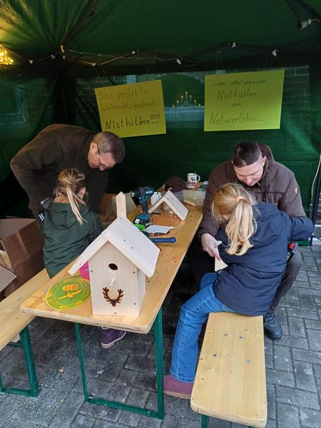 Die Jugendgruppe „Die Falkenaugen“ des Hegeringes Rastede Nord hatte sich überlegt mit Besucherkindern Meisennistkästen zu basteln, denn Artenschutz kann jeder Einzelne schon im eigenen Garten praktizieren. Außerdem ist es schön, wenn Kinder erleben, wie ihr selbst zusammengebauter Nistkasten im heimischen Garten von Vögeln angenommen wird und Leben entsteht.