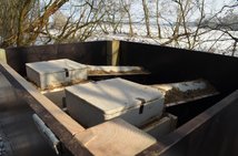 Um eine längerlebige, nicht abrutschende Steilwand zu schaffen, wurde eine neue Kiste aus 18mm starken Siebdruckplatten gebaut, die die beiden Bruthöhlen aufnimmt und ein Verrutschen bzw. Absacken dieser verhindert. Die Kiste hat die Maße 1,25m x 1,25m x 1,00m. Die Einfluglöcher, die einen Durchmesser von 70mm haben, wurden in einer Höhe von 80cm mit einer Lochsäge gesägt. Diese gewählte Höhe ist wichtig, damit in die Einfluglöcher kein Raubwild eindringen kann. Bei den verwendeten Bruthöhlen fiel die Wahl, nach längerer Internetrecherche, auf die Bruthöhle der Firma Schwegler. Diese besteht aus einer 60cm langen Röhre aus klimaausgleichendem und atmungsaktivem Leichtbeton mit einem anschließenden Brutraum. Die offene Bodenunterseite der Röhre bzw. des Brutraumes ist mit einem Drahtgeflecht, das ein Eindringen von Mäusen und Ratten verhindert, versehen. Da die Zugangsröhren und der Brutraum in Sand liegen sollen und ein erneutes Absacken des Moorbodens verhindert werden sollte, wurden extra Podeste für die Brutröhren und den Brutraum gebaut. Auf diesen Podesten lagern die Nisthilfen im Sand ohne das später etwas abrutschen kann. Feuchtigkeit kann so durch den Sand besser abfließen. Auch wurde etwas Sand in den Brutraum gestreut. Die Falkenaugen entschieden sich wieder für den Einbau von zwei Röhren, da unter natürlichen Bedingungen, die Erst- und die Zweitbrut meist in verschiedenen Röhren stattfindet.