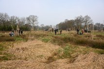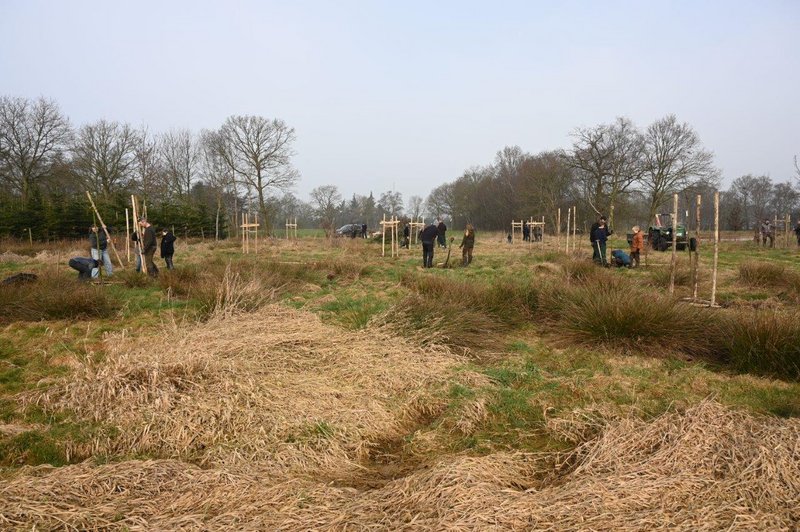 Auf ca. 3000 qm wurden 21 hochstämmige Obstbäume gepflanzt. Hierbei wurden überwiegend Apfelbäume der unterschiedlichsten Sorten verwendet, da sich diese sehr gut auf moorigem Boden entwickeln. Um jedem Baum wurden drei Pfähle gesetzt, an denen die Pflanze mit einem speziellen Kokosband angebunden wurde. Eine Manschette aus Maschendraht soll verhindern, dass der Rehbock mit seinem Gehörn oder andere Wildtiere die Rinde verletzen.