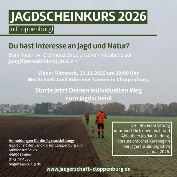 Auch in 2026 bietet die Kreisjägerschaft Cloppenburg e. V. wieder einen Kurs für die Jungjägerausbildung an.