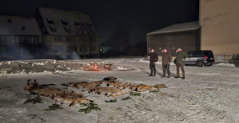Eine der erfolgreichsten Fuchswochen des Hegerings 5 (Vienenburg) hielten wir in der Woche vom 8.02.2025 bis zum 16.02.2025. So sorgten wir hoffentlich für einen guten Start in ein Jahr 2025 für unser Niederwild. Bei der Abschlussveranstaltung traditionsgemäß in der Domäne Weddingen konnten wir die Strecke von 24 Füchsen und 4 Waschbären präsentieren. Wir danken noch mal den Bläsern der Bläsergruppe aus Gielde sowie einigen Hegering Mitgliedern für Ihr musikalische Umrahmung. Fuchsscheibe 2024 Nils Hundertmark , Gustl Bock und Martin Kowalewsky Zum Erleger der meisten Füchse konnten wir Gustl Bock aus dem Revier Wiedelah mit der Fuchsscheibe zu 5 erlegten Füchse und 2 Waschbären gratulieren, ganz knapp vor Thees Augustin und Carlo Diegmann beide mit 4 Füchsen.