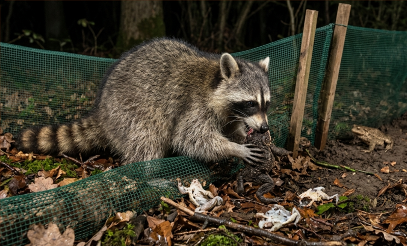 Amphibien wie Teichfrosch (Rana lessonae) und Grasfrosch (Rana temporaria) sind in der Laichzeit leichte Beute. Ebenso fressen Waschbären gerne Mäuse oder Wühlmäuse (Arvicolinae), was wiederum Greifvögeln wie Mäusebussard (Buteo buteo) die Nahrungsgrundlage entzieht.