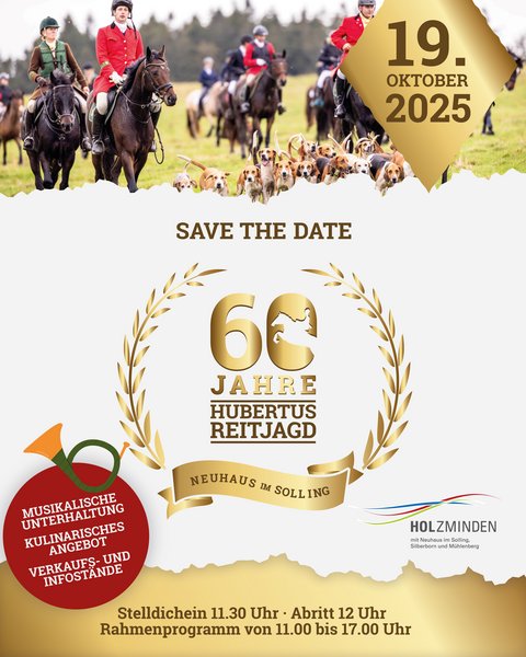 Am 20. Oktober lädt die Stadt Holzminden, als Veranstalter der 59. Hubertusreitjagd, herzlich nach Neuhaus ein. Mit einem bunten Rahmenprogramm bei dem die Rollende Waldschule der Jägerschaft Holzminden nicht fehlt. Es werden traditionelle Jagdhornklänge durch das Bläserkorps Tannengrund der Jägerschaft Holzminden erklingen.