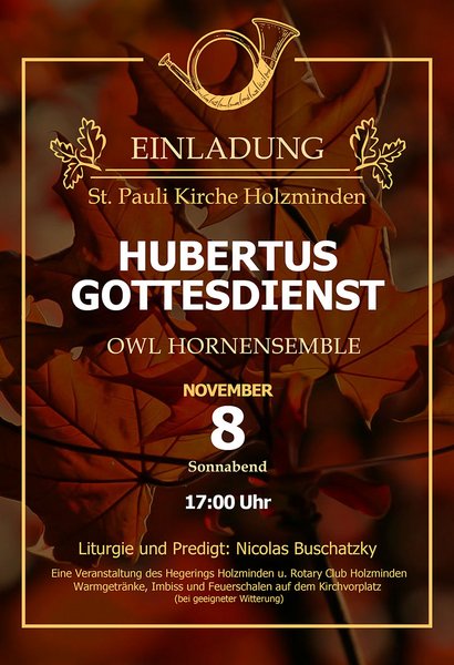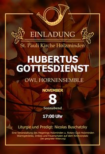 Auf Initiative des Rotary Club Holzminden sowie des Hegering Holzminden veranstaltet die Evangelisch-lutherische Kirchengemeinde Holzminden am 11. November 2018 eine Hubertusmesse. Beginn ist 17 Uhr in der Lutherkirche am Marktplatz Holzminden. Die Predigt wird Superintendent Ulrich Wöhler halten und für die passende musikalische Umrahmung sorgen die Stadtoldendorfer Parforcehornbläser. Bei geeigneter Witterung wird die Jungfeuerwehr Holzminden vor der Kirche Feuerschalen aufstellen und somit noch im Anschluss an den Gottesdienst für eine stimmungsvolle Atmosphäre sorgen. Dazu werden Heißgetränke und Punsch gereicht.