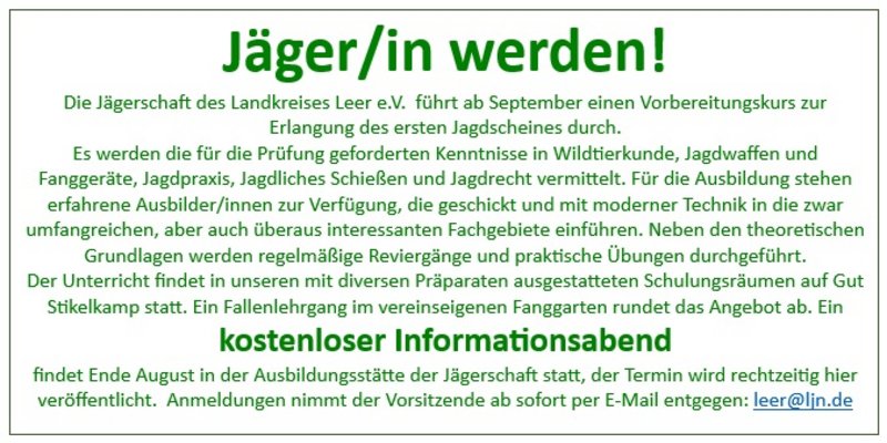 6,5 Monate fuhren die Kursteilnehmer/-innen montags und donnerstags zum Gut Stikelkamp, der Ausbildungsstätte der Jägerschaft in Landkreis Leer e.V. um sich auf die Jägerprüfung…
