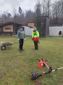 Das Wetter war perfekt für die anstehenden Pflegearbeiten auf dem Gelände. Der Regen der vorherigen Tage hatte endlich aufgehört und die Temperatur passte, der Himmel war fast klar. Ausgerüstet mit Motorsägen, Freischneidern, Heckenscheren und allerlei anderem Handwerkszeug wurde auch in diesem Jahr der Rückschnitt durchgeführt. Der Aufwuchs im Bereich der Kugelbahn wurde dezimiert und auch am Traphang wurde der Bewuchs zurückgeschnitten.  Auf dem Wall des laufenden Keilers wurde das Gebüsch gekappt und die Buchenhecke am Eingangsbereich gestutzt