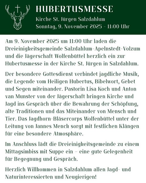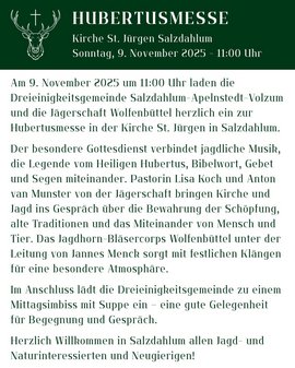 Die Hubertusmesse wird jährlich um den 3. November, dem Hubertustag, gefeiert und erinnert an den heiligen Hubertus von Lüttich. Dieser war einst ein leidenschaftlicher Jäger, der die Erlegung von Wild als Selbstzweck betrachtete. Doch durch eine tiefgehende spirituelle Erkenntnis lernte Hubertus, dass alle Geschöpfe Gottes Respekt und Pflege verdienen. Diese Haltung, die als „Achtung vor dem Geschöpf“ bekannt ist, wurde zu einem zentralen Prinzip der Waidgerechtigkeit in der Jägerschaft.